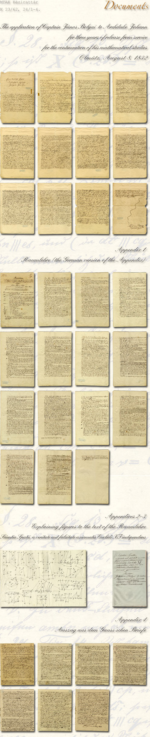 Bolyai János mérnökkari másodszázados folyamodványa, 4 melléklettel, János főherceghez három évi szolgálati felmentésére matematikai kutatásai folytatására és műve (A Tér tudománya) elfogadtatása érdekében. Olmütz, 1832. augusztus 8.